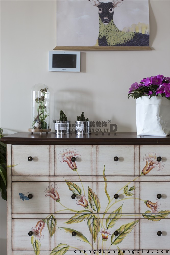 设计理念:NG大舞台有梦你就来绿地468云玺简美风格完工照 楼盘:NG大舞台有梦你就来绿地468 风格:简美 设计师:王利 业主丁女士是一枚软妹纸,装修风格自然离不开小清新范。本案户型面积为小套三,布局比较紧凑,为了满足业主的功能需求,设计上也是颇费脑筋,以争取最大化的利用空间。 本案地面入户玄关为小方砖斜贴,一进门就能感受到玄关的灵动。客餐厅为仿古砖加角花,在人工费上会比普通的600*600砖贵出一截。卧室、厨房和卫生间的门槛石均用彩色竖条纹砖代替传统石材材质,给人一种不同的视觉体验,也增加的突出主题风格。电视墙做了简单造型,中间部分利用墙纸做出层次感。吊顶采用了石膏线和挂镜线结合,在成本相同的情况下,做出了不同的吊顶设计也最大化的简化了顶面的复杂层次保留了空间通透清爽的布局。 本案的花草软装大多从TB采购,也体现了女主人勤俭持家的一面。客厅阳台花园较小,但是通过一番精心的布局后,一个立体休闲的花草世界呈现在大家面前。可以说在有限的空间布局里做到了一步一景,一角一景。